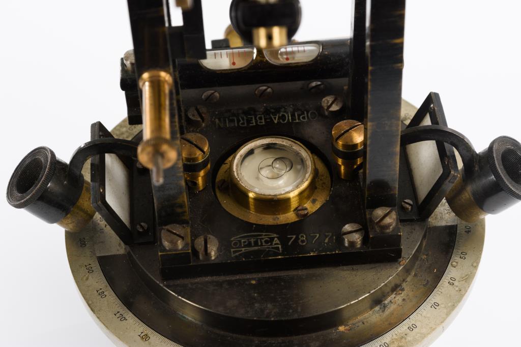 3-beiniger Fuß mit Libelle, Vollkreis, 2 Lupen über Nonien sowie Feinbewegungen. Fernrohr mit Libelle, Objektivkappe sowie Absehe. Wenige Alters-/Gebrauchsspuren.