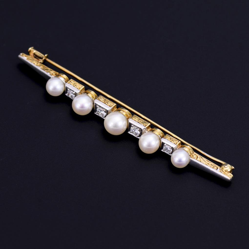 Nadel mit 5 Zuchtperlen im Verlauf und 4 eingelassenen, kleinen Brillanten. Schiebehaken.