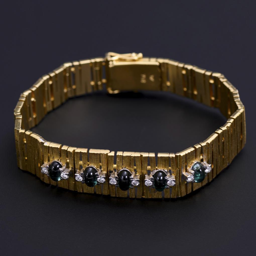 Struktuiertes Verlaufgliederband mit 5 Turmalincabochons und 10 Brillanten. Kastenschloss mit 2 Achtersicherungen.