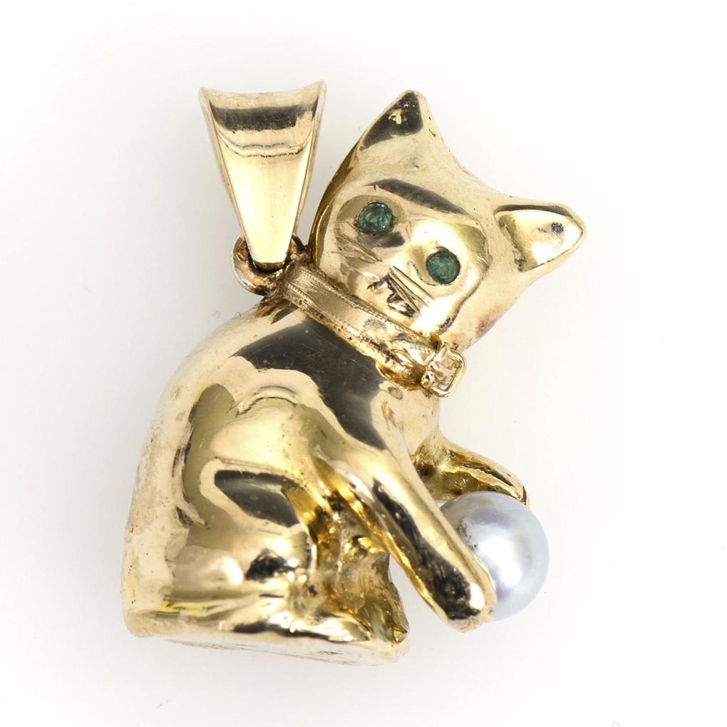 Vollplastischer Anhänger mit hellgrauer Zuchtperle und kleinen Smaragdaugen.