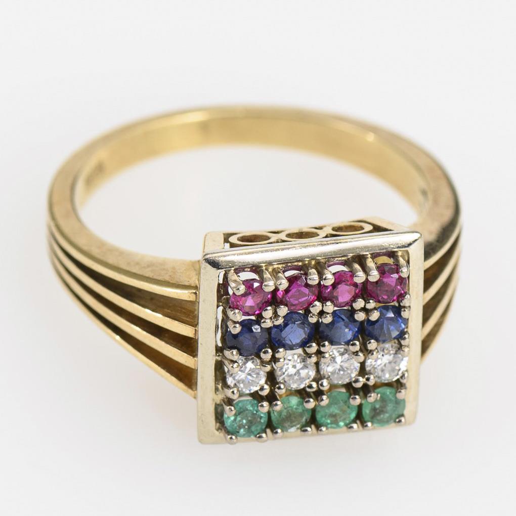 4 chatongefasste Smaragde, Brillanten, Saphire und Rubine zwischen 4-stegiger Schulter und mittlerer Schiene.