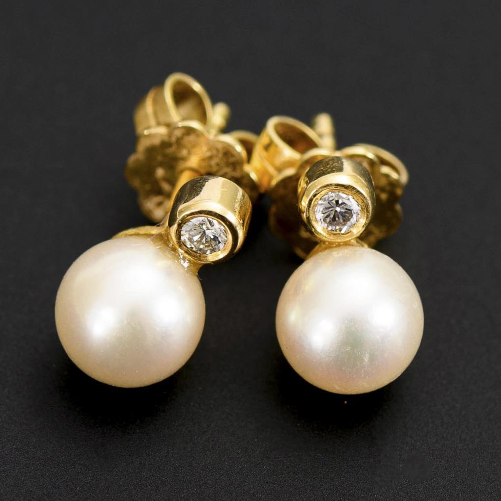 Ohrsteckerpaar mit Zuchtperlen und Brillanten.