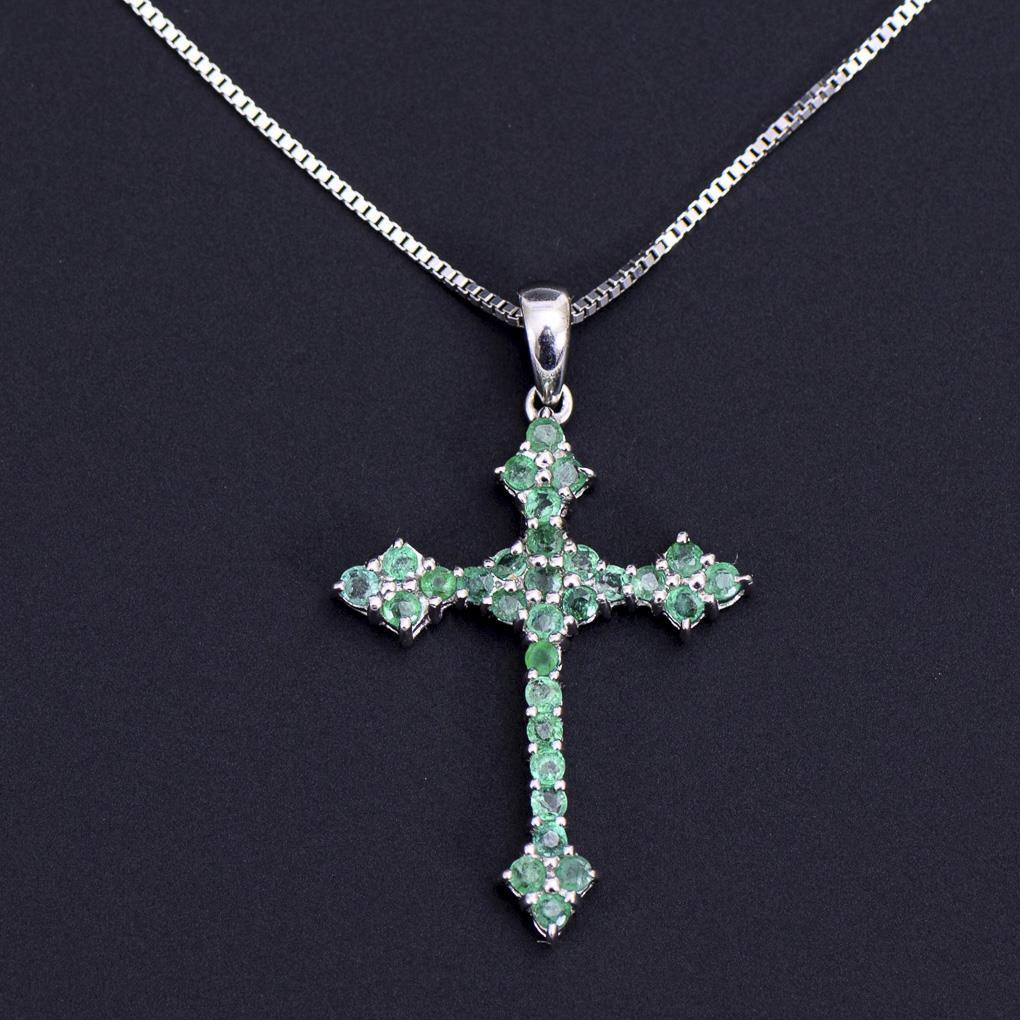 Kreuzanhänger mit 30 kleinen Smaragden, an zarter Venezianerkette mit Karabinerschließe.