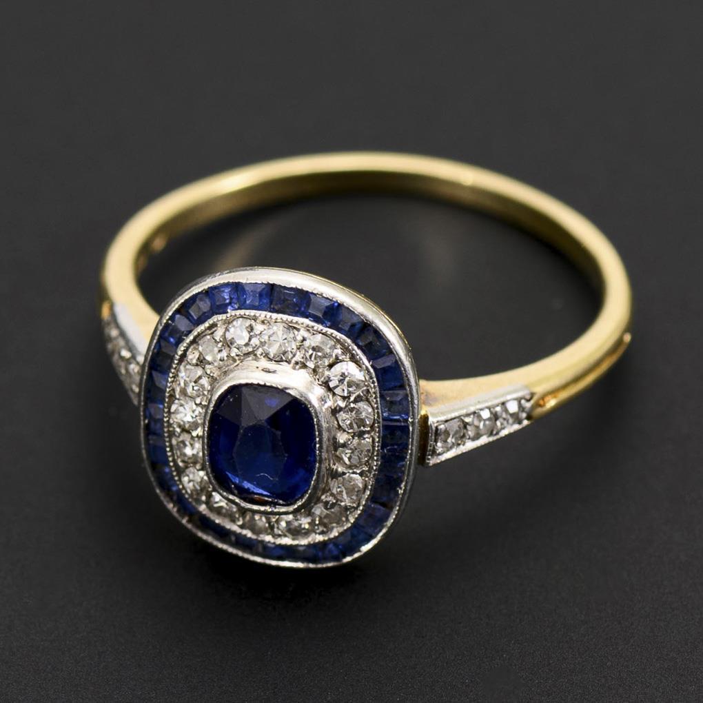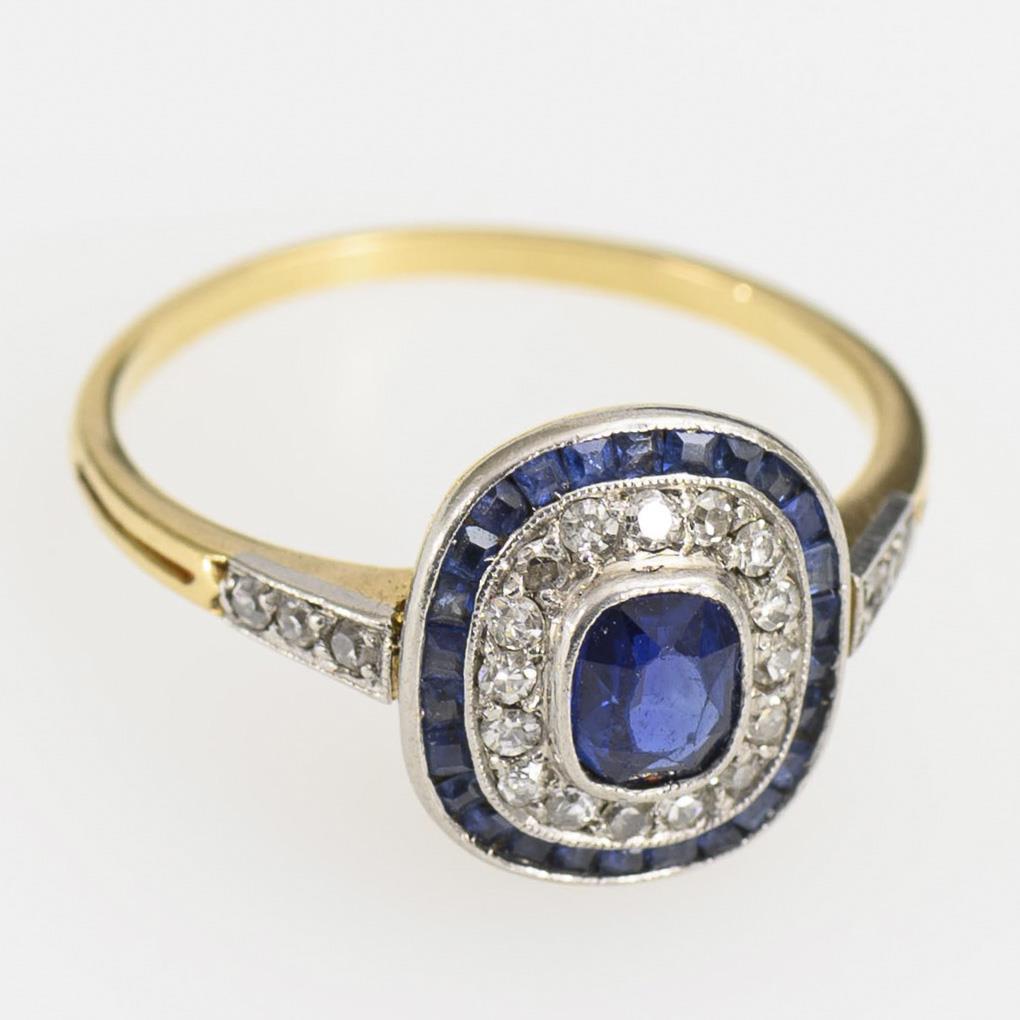 Art-déco-Ring mit Saphir und Altschliff-Diamanten.