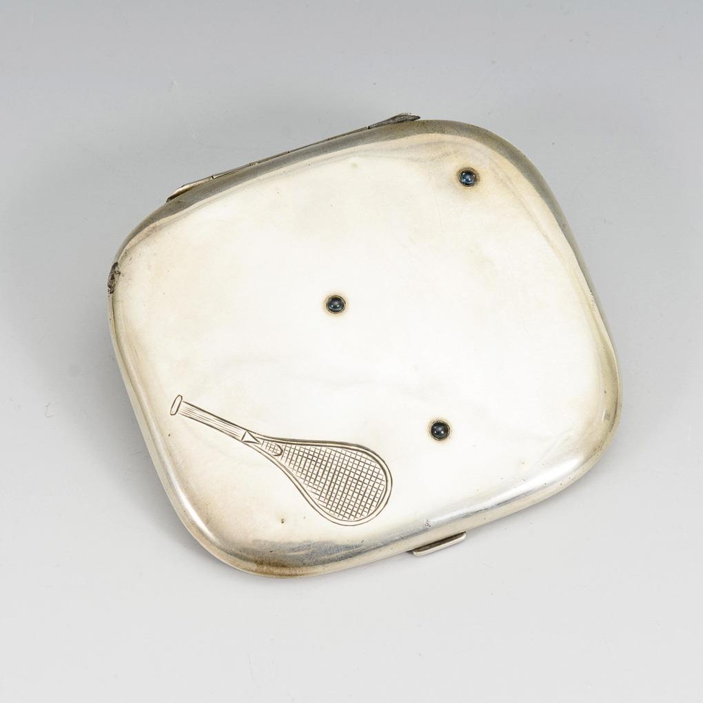 Schlichtes Etui mit graviertem Tennisschläger. Stark gedellt, innseitige Bruchstelle (durch die Gravur bedingt).