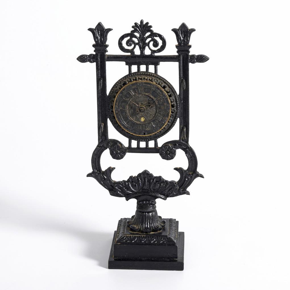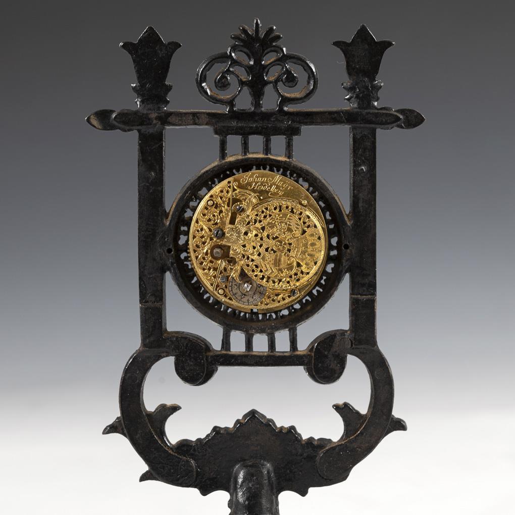 Kleiner Eisenguss-Ständer mit barockem Taschenuhrwerk "Mayr".