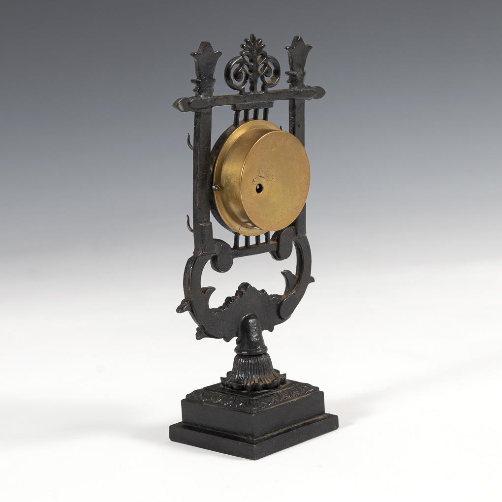 Durchbrochen gefertigtes Uhrengehäuse mit Lyra im Louis Seize-Stil, mit kannelierten und hakenbesetzten Seitenstreben, Akanthusblattwerk und Rosetten, auf gestuftem Quadratsockel. Wohl als Spiegelgestell konzipiert. Königlich Preußische Gießereien oder Carlshütte bei Rendsburg.