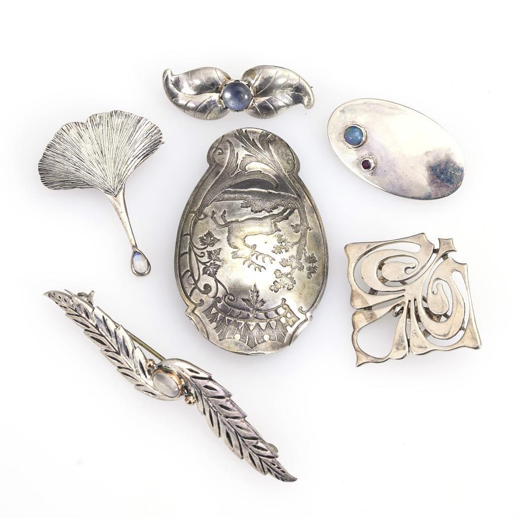 4 Broschen mit zargengefassten Mondsteincabochons, 1 Brosche mit Opalcabochon und kleinem Rubin. Brosche mit Hirschdekor. Kugelhaken, Hakenverschluss.
