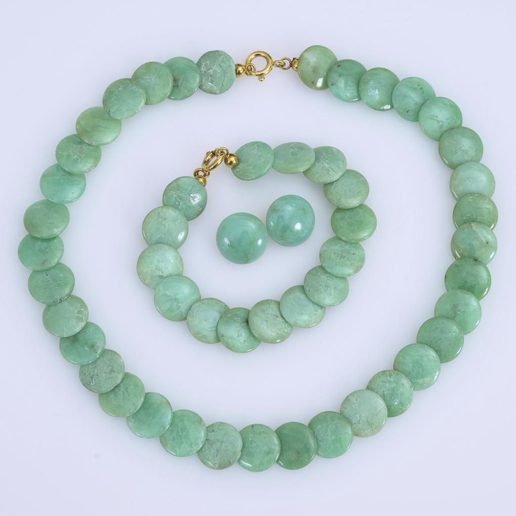 Verschlüsse Silber vergoldet. Kette L 46 cm. Armband L 21,5 cm. Ohrklipp Ø 1,8 cm. 47,8/21,4/6,6 g.