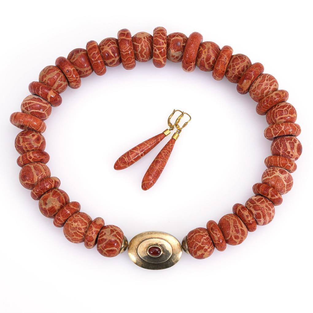 Schnürkette mit Schaumkorallenkugeln und -ringen an großer Zierschließe mit Feueropalcabochon. Passende Ohrhänger an Federbügel 925er Silber, vergoldet.