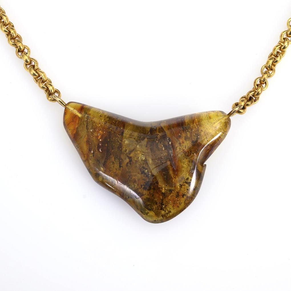 Teils klargelbes Bernsteinstück, zwischen massiver Erbskette mit Ringfederschließe.