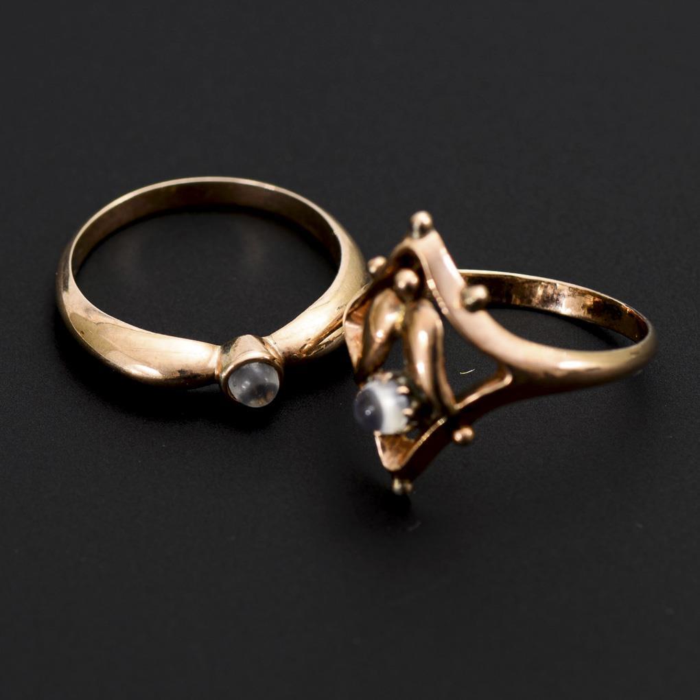 Zargengefasste Cabochons zwischen schmaler Schiene und verziertem Ringkopf.