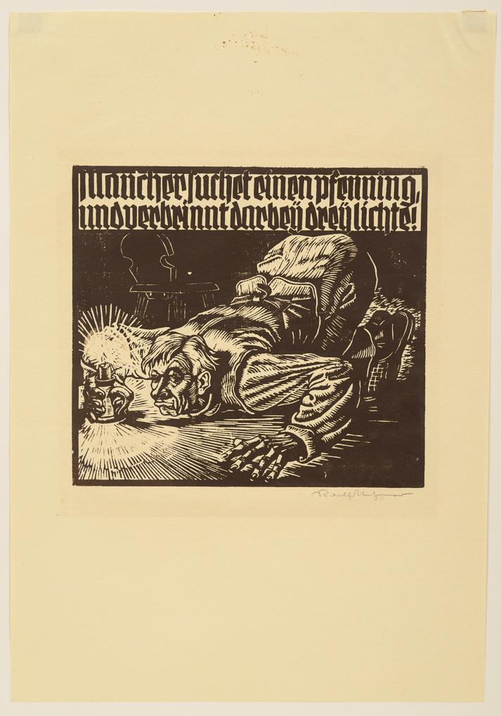 Holzschnitt zur Volksweisheit "Mancher suchet einen Pfennig und verbrinnt darbey drey Lichte". Minimal stockfleckig.