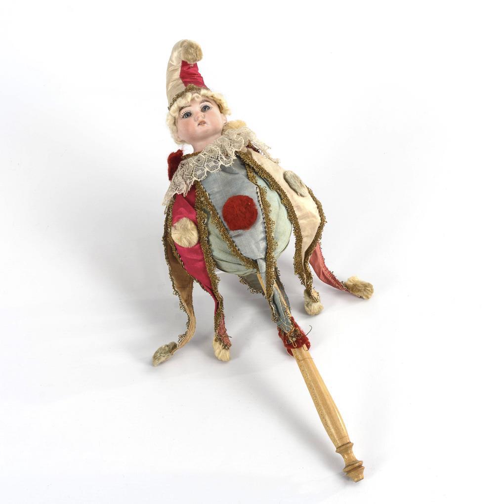 Brustkopf mit blauen Glasaugen, blonder Mohairperücke und drehbarem Pappkörper auf Drechselstab. Originalbekleidet mit Narrenkappe und Gewand mit Zipfeln. Spieluhr intakt. Leichte Altersspuren, Augen minimal bestoßen.