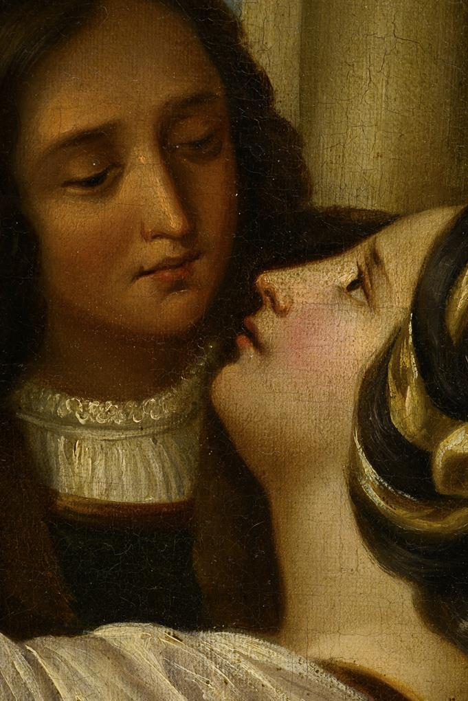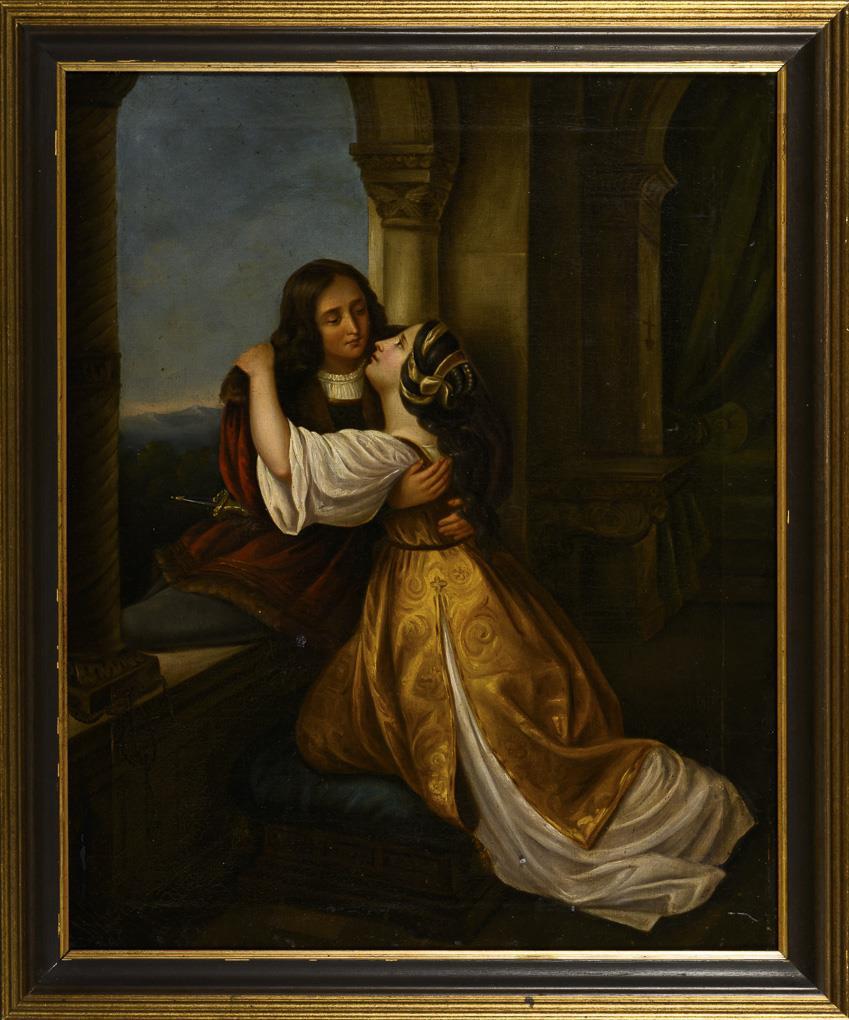 Das Liebespaar im historischen Kostüm am Fenster mit Blick in die weite Landschaft. Nachtrag 30.5.22: Kopie nach Ferdinand Sohn "Romeo und Julia".. Eine kleine restaurierte Stelle.