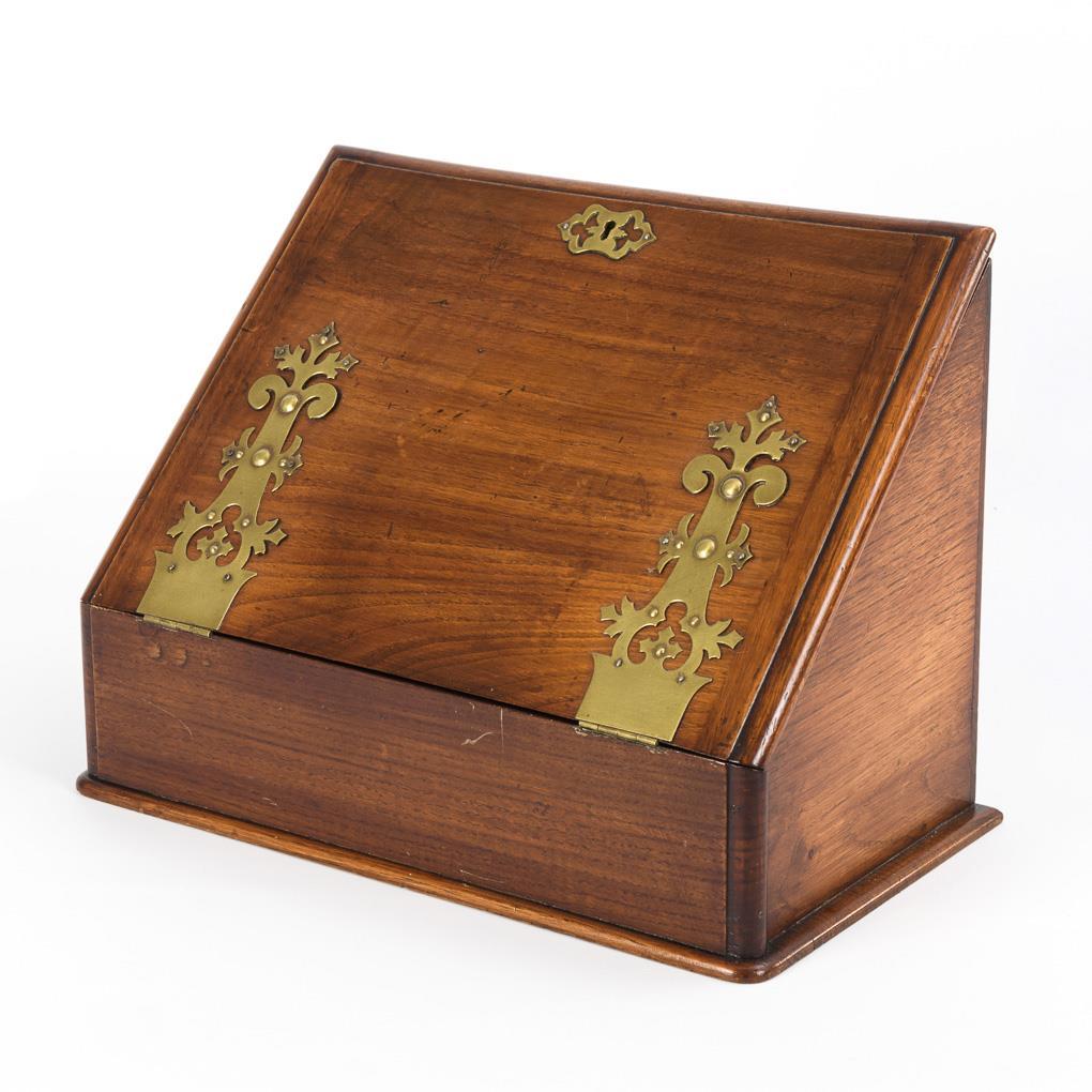 Schrägpult-Schatulle mit dekorativen Beschlägen, aufgeklappt schräge Schreibfläche, zahlreiche Fächer für Briefe und Dokumente, 2 Tintenfässer sowie Geheimfächer. Pultdeckel verzogen, einige Alters-/Gebrauchsspuren, Tintenfässer ergänzt.