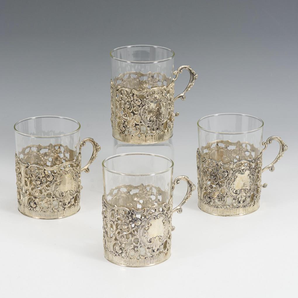 Durchbrochene, floral reliefierte Silberhalterungen mit Rocaillenzier. Glaseinsätze von Schott, Mainz.