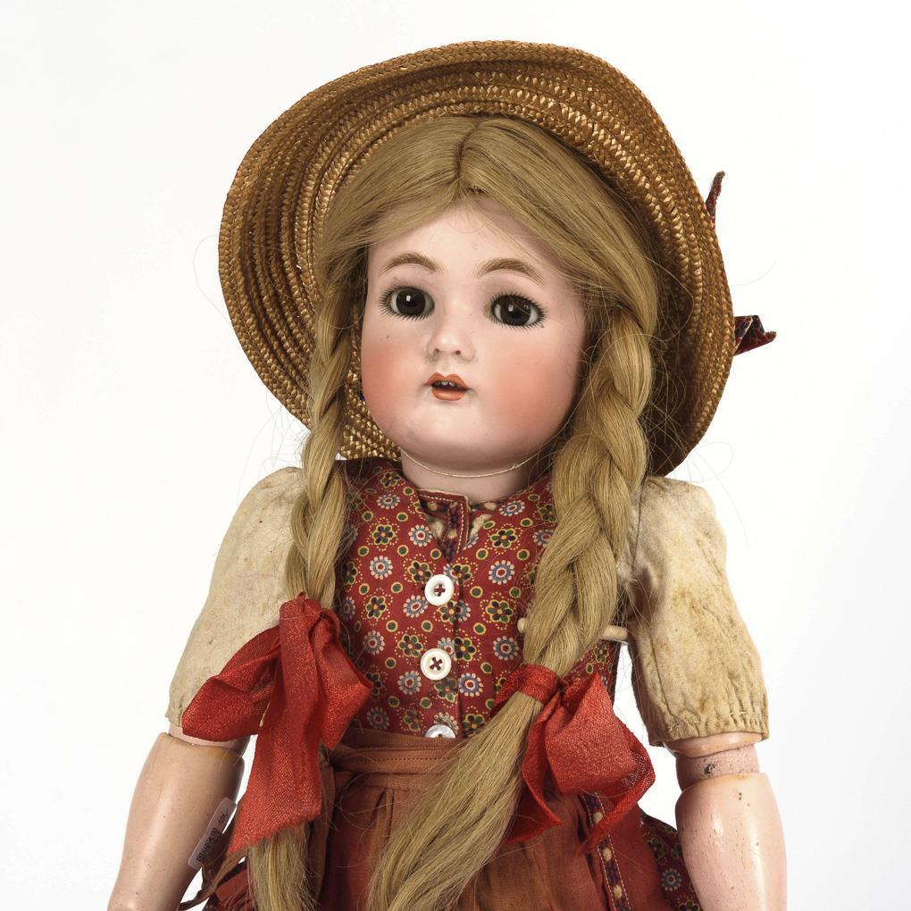 Kurbelkopf, braune Schlafaugen, Wimpern, Ohrringe, blonde Echthaarperücke mit Zöpfen. 15-teiliger Gliederkörper. Alte Unterwäsche, rotes Kleid und Schürze, Strohhut. Kopf durchleuchtet: lediglich kurzer Kratzer unter dem linken Ohr.