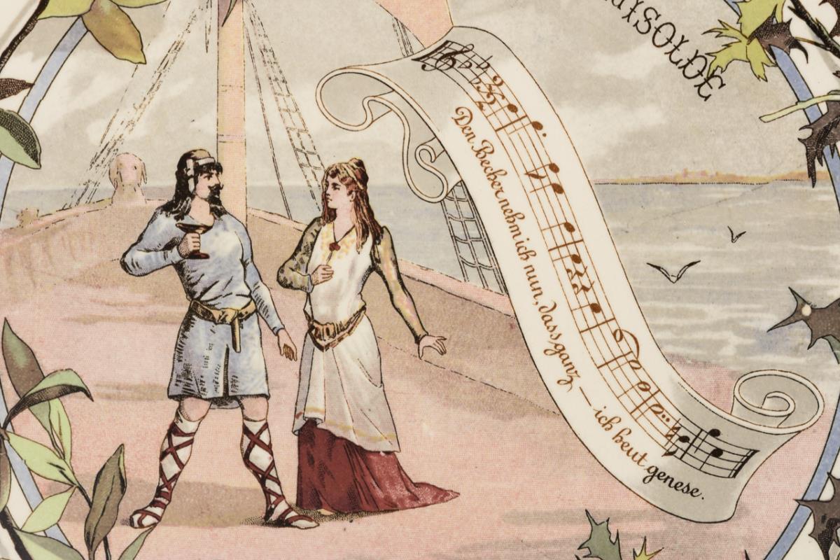 Thementeller mit Motiven aus "Rienzi", "Tristan und Isolde" sowie "Die Walküre", am unteren Rand das Profil Richard Wagners. Jeweils mit Seilaufhängung. Minimale Glasurchips.