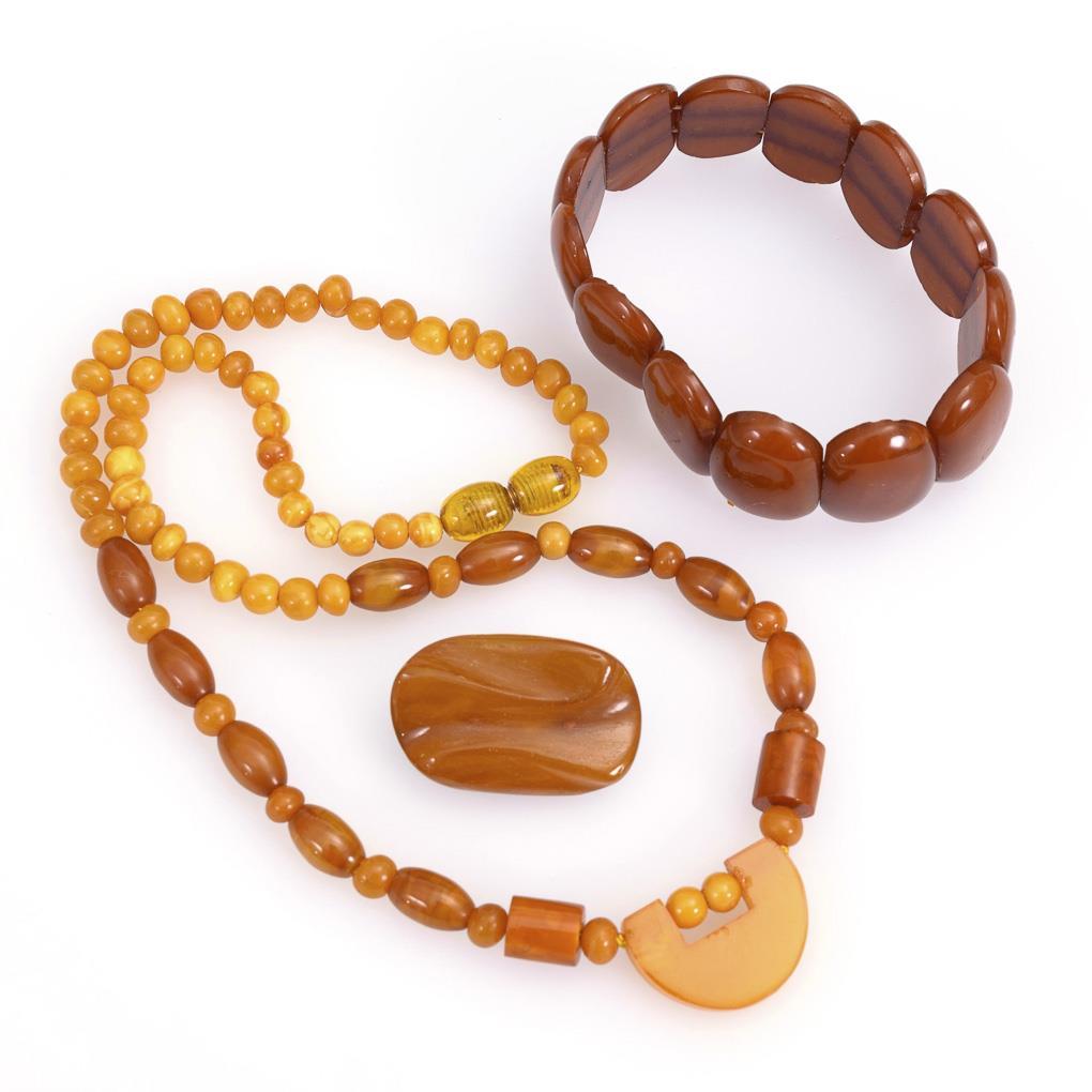 Schnürkette mit Schraubverschluss, Armband mit Gummizug und Brosche mit Hakenverschluss.