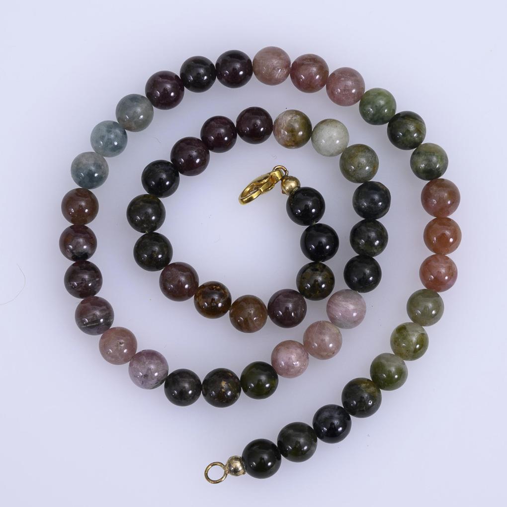 Schnürkette mit verschiedenfarbigen Turmalinkugeln, an Metall-Karabinerschließe.