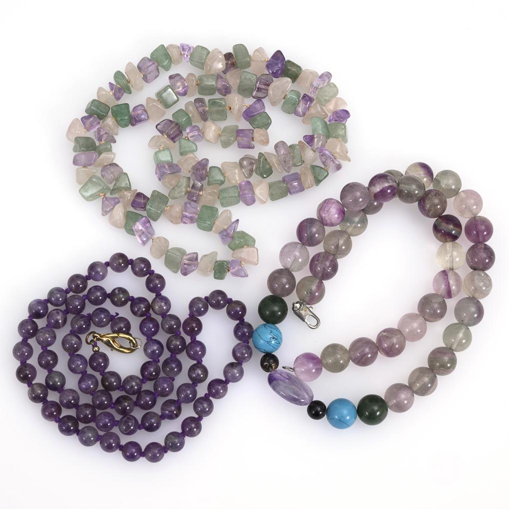 Schnürketten mit verschiedenen Quarzkugeln, Amethyst- und Rosenquarzen, Fluoriten? und 2 Türkisimitationen. Metall-Karabinerschließen.