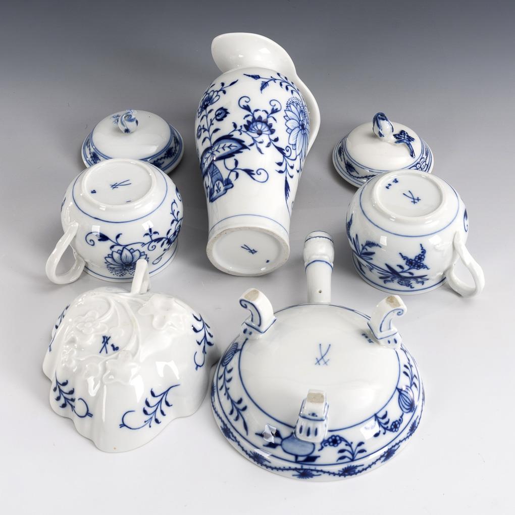 Essigkännchen (H 17,5 cm), 2 Crémetöpfchen (H 9 cm), 1 Blattschale (L 12,5 cm) und 1 Stielpfännchen (H 9 cm). Minimale Bestoßung an 1 Rosenknauf.