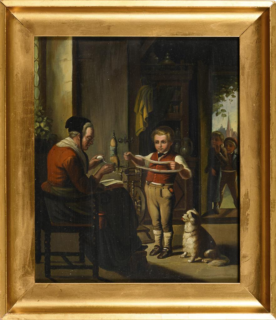 Großmutter und Enkel bei der Arbeit vor dem Spinnrad mit zuschauendem Hund sowie rufende Freunde in der offenen Tür mit Blick zur Stadt. Nachtrag 30.5.22: Kopie nach Johann Hermann Kretzschmer (1811 Anklam- 1890 Berlin).