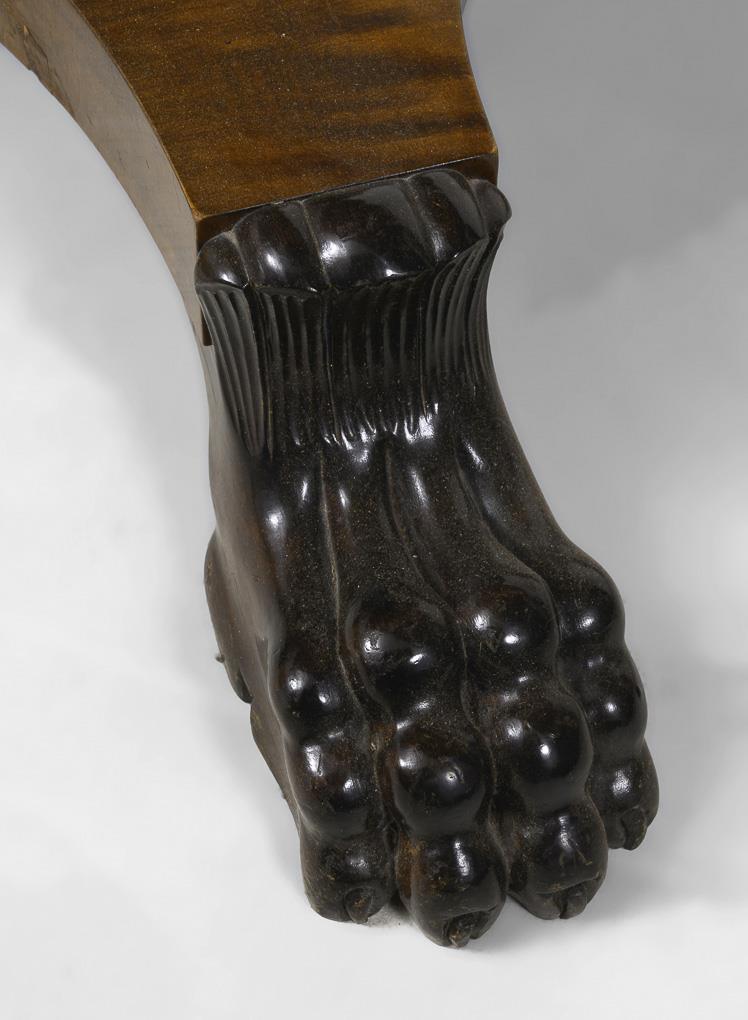 Seitenwangentisch auf Baluster-Mittelstütze mit konkav eingezogener Fußplatte und 4 ebonisierten Tatzenfüßen. Leichte Alters-/Gebrauchsspuren, Furnier mit kleinen Defekten.