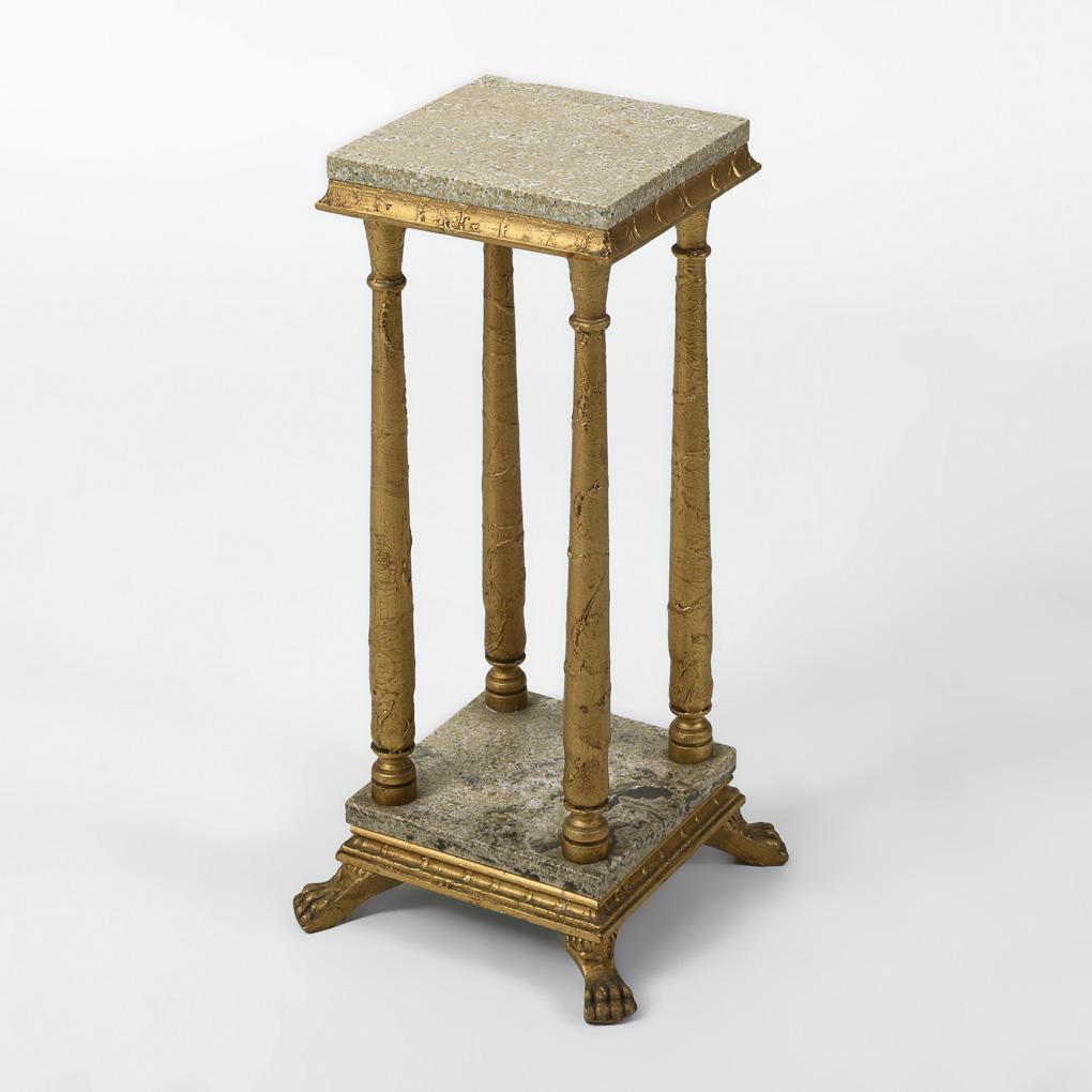 Stuckiertes, goldbronziertes Holz, gräulich-hellgrüner Marmor. H ca. 69 cm, obere Platte: ca. 25 x 25 cm.