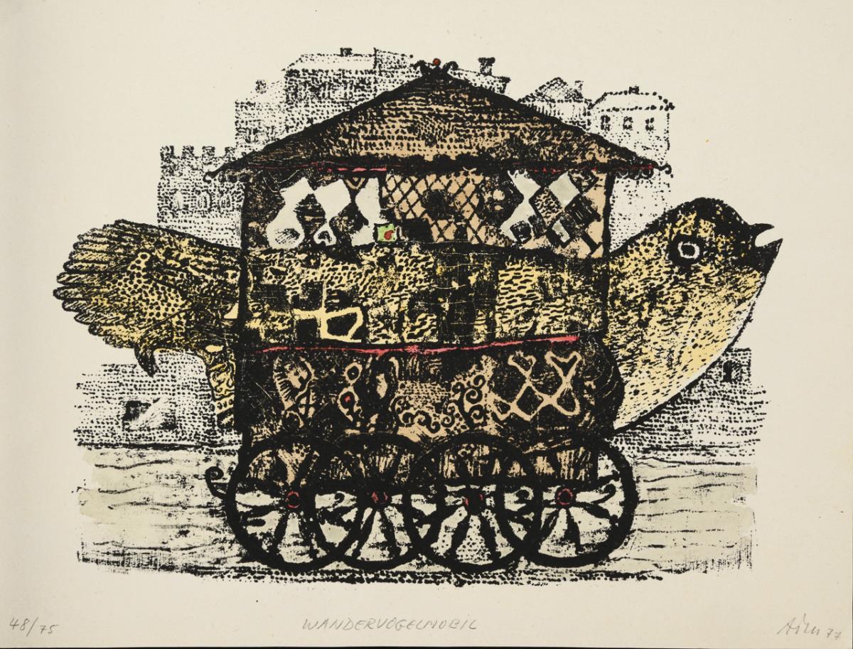 "Wandervogelmobil", Blatt: 15,2 x 20 cm, Exemplar: 48/75, [19]77, verso Stempel "1978 Behaust und beweglich bleiben", mit handschriftlichen Grüßen "Unser Wunsch für Sie, herzlich Adrian, Helga, Alfred Mörstedt | "Frohlockendes Zibebenbäumchen", Blatt: 18 x 26 cm, Exemplar: 42/65, [19]73, verso handschriftliche Grüße "mit herzlichen Weihnachts- und Neujahrsgrüssen Alfred + Helga 1973", etwas knickspurig | "Rotauge im Lustwandelwäldchen", Blatt: 25,5 x 18,5 cm, Exemplar: 36/40, [19]72, verso Stempel "herzliche festgrüsse" und handschriftliche Grüße "von ihrem Alfred und Helga Weihnacht 1972", etwas knickspurig.