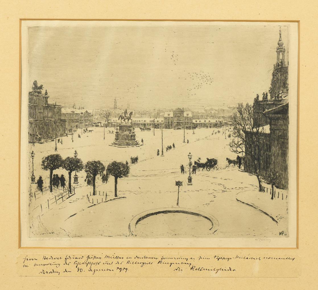 Dresden mit italienischem Dörfchen an der Semperoper, Passepartout mit handschriftlicher Widmung an "Herrn Stadtrat Eduard Gustav Müller in dankbarer Erinnerung an die 12jährige Mitarbeit, namentlich Verwaltung des Schlachthofs und des Ritterguts [...] Dresden, 30. September 1919. Die Ratsmitglieder", gedruckt von Heinz Wetteroth, München.