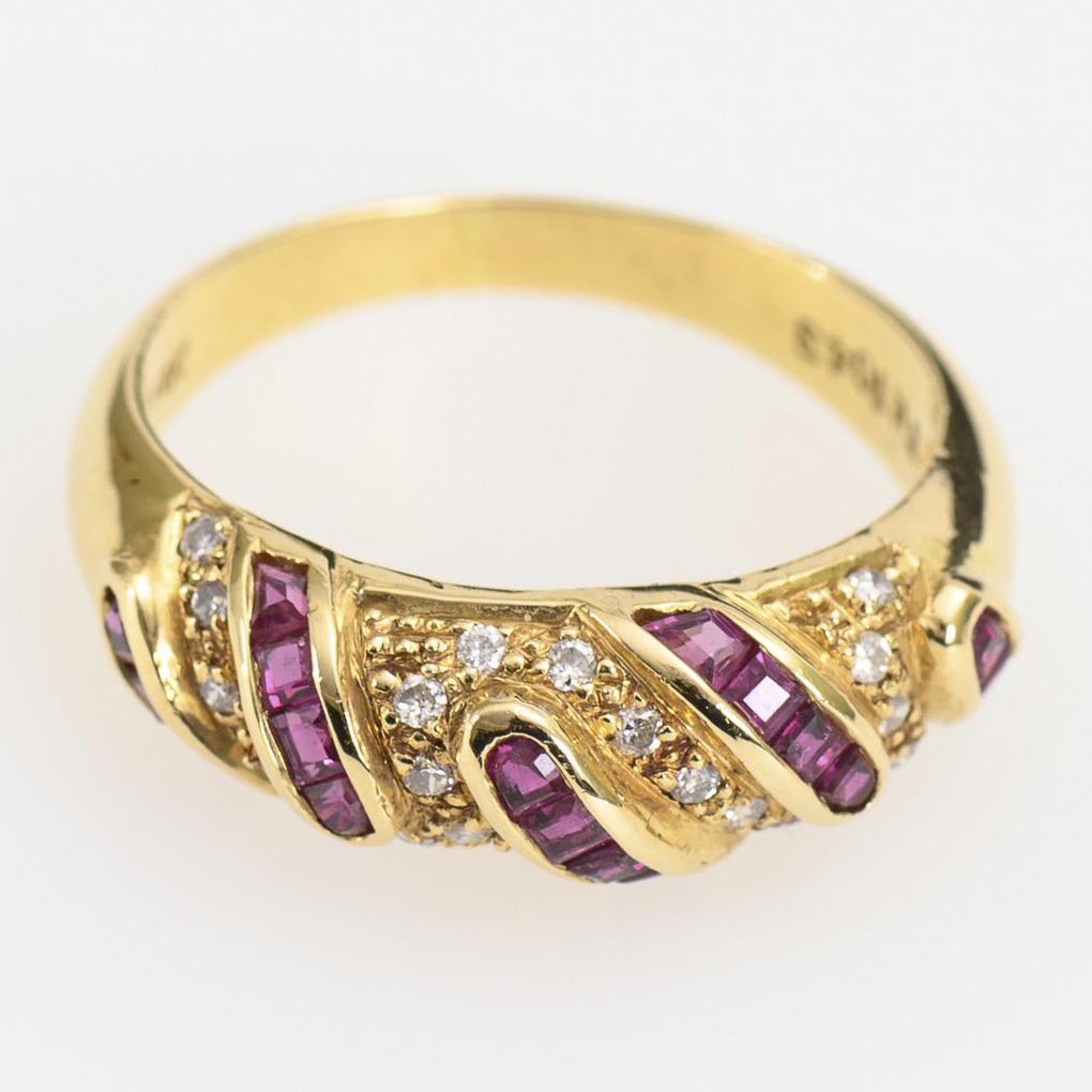Mittlerer Bandring mit Rubincarrés und 18 kleinen Brillanten.
