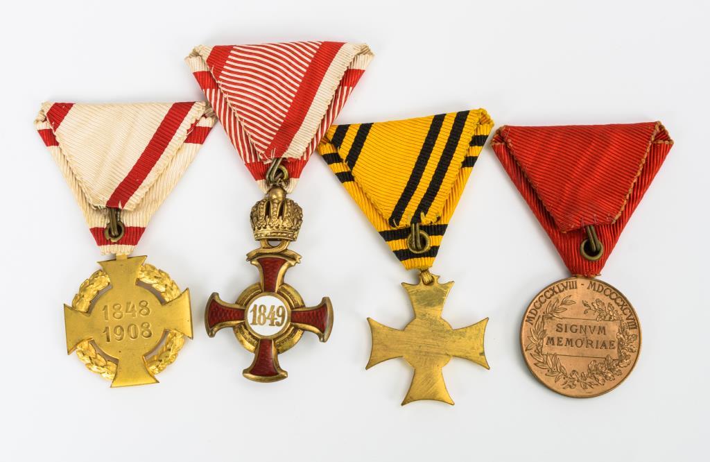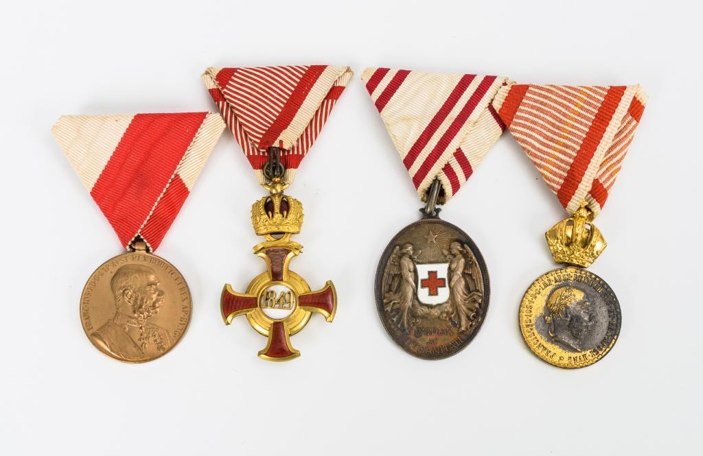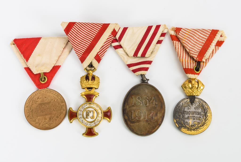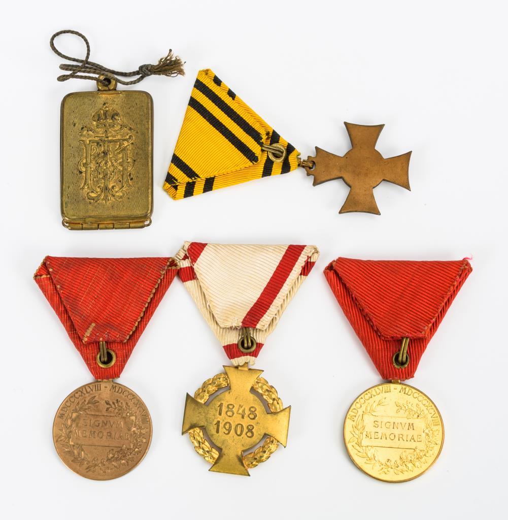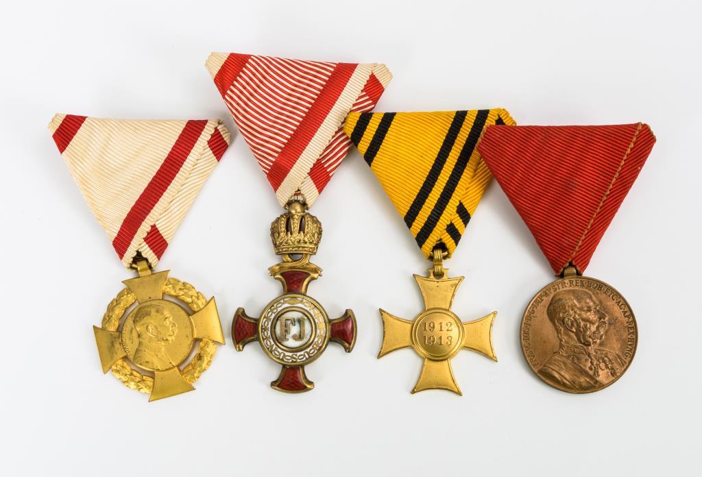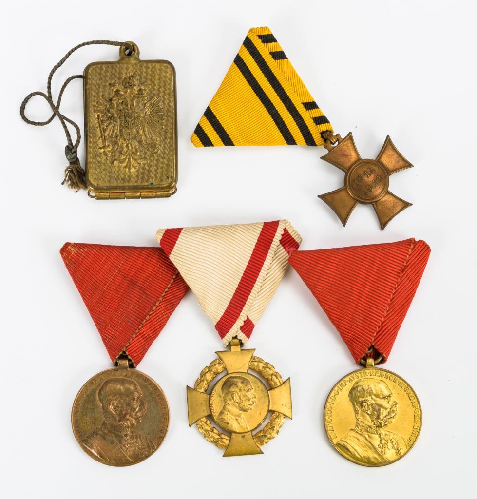1 gefüllter Identifikations-Anhänger mit dem Monogramm von Franz Joseph I. sowie verschiedene Orden/Auszeichnungen am Band. Einige Alters-/ Gebrauchsspuren.