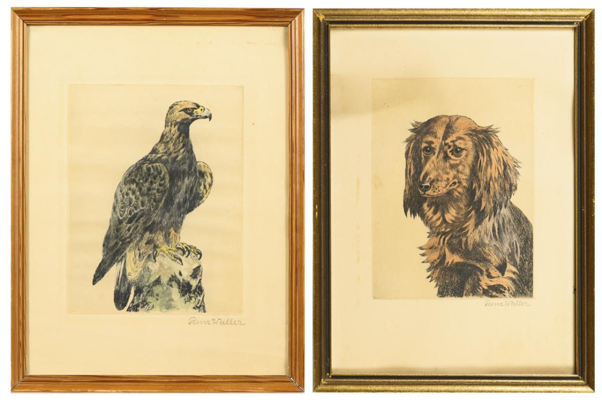 Dackel: Platte: 27,5 x 20,5 cm, gerahmt & hinter Glas: 48 x 35 cm | Adler: Platte: 25,5 x 19,5 cm, gerahmt & hinter Glas: 43 x 33 cm. Je etwas knickspurig und stockfleckig.