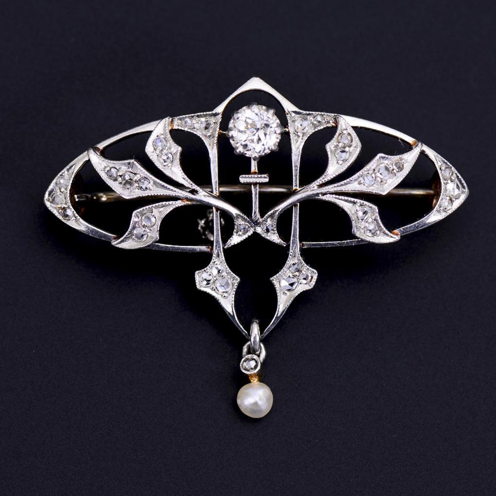 Jugendstilbrosche mit Altschliff-Brillant und Diamantrosen.