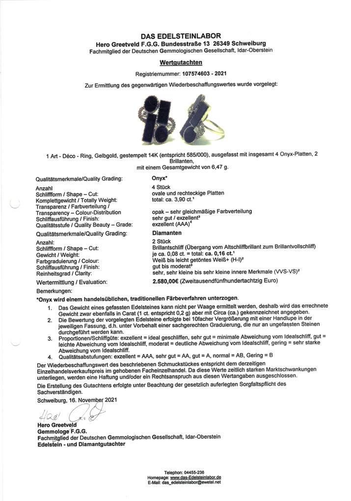 Gelbgold 14 k gestempelt. Ringgröße 51. Onyx gesamt ca. 3,90 ct/Brillanten gesamt 0,16 ct/H-I/vvs-vs. 6,4 g.