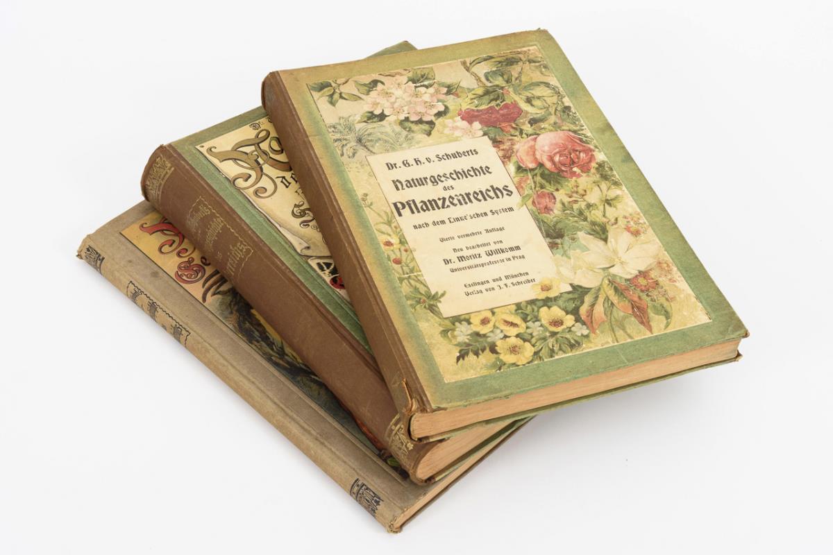 "Naturgeschichte des Pflanzenreichs nach dem Linne'schen System", 4. vermehrte Auflage. / "Naturgeschichte des Tierreichs für Schule und Haus", in drei Teilen. 2 Tafeln lose, aber ohne Verluste. / "Naturgeschichte Geologie, Mineralreich, Paläontologie". Bände mit einer Vielzahl von Farblithografien. Papp- bzw. Halbleineneinbände. Altersgemäße Gebrauchsspuren.