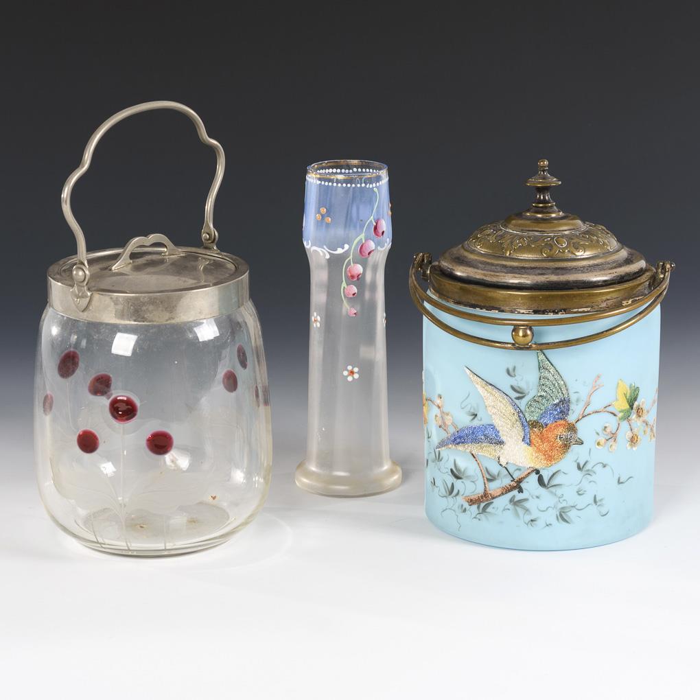 1x zylindrische Dose aus hellblauem Milchglas mit Messingmontierung und schauseitigem, polychrom emailgemaltem und mit Glasperlen belegtem Vogelmotiv (H 23,5 cm). / 1x leicht konvexe Vase mit Metallmontierung und aufgeschmolzenen roten Glastropfen (H 24 cm). / 1x schrägoptisch geblasene Stangenvase mit polychrom emailgemalten Blüten und Beeren (H 19 cm). Minimaler Goldabrieb an der Vase.