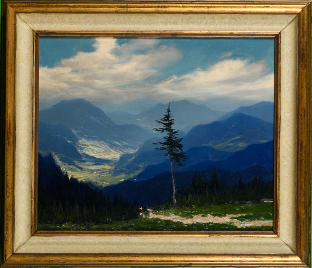 Blick von einem Berg über das weit verlaufende Tal zwischen den Bergen unter heiterem Himmel. Leichte Altersspuren.