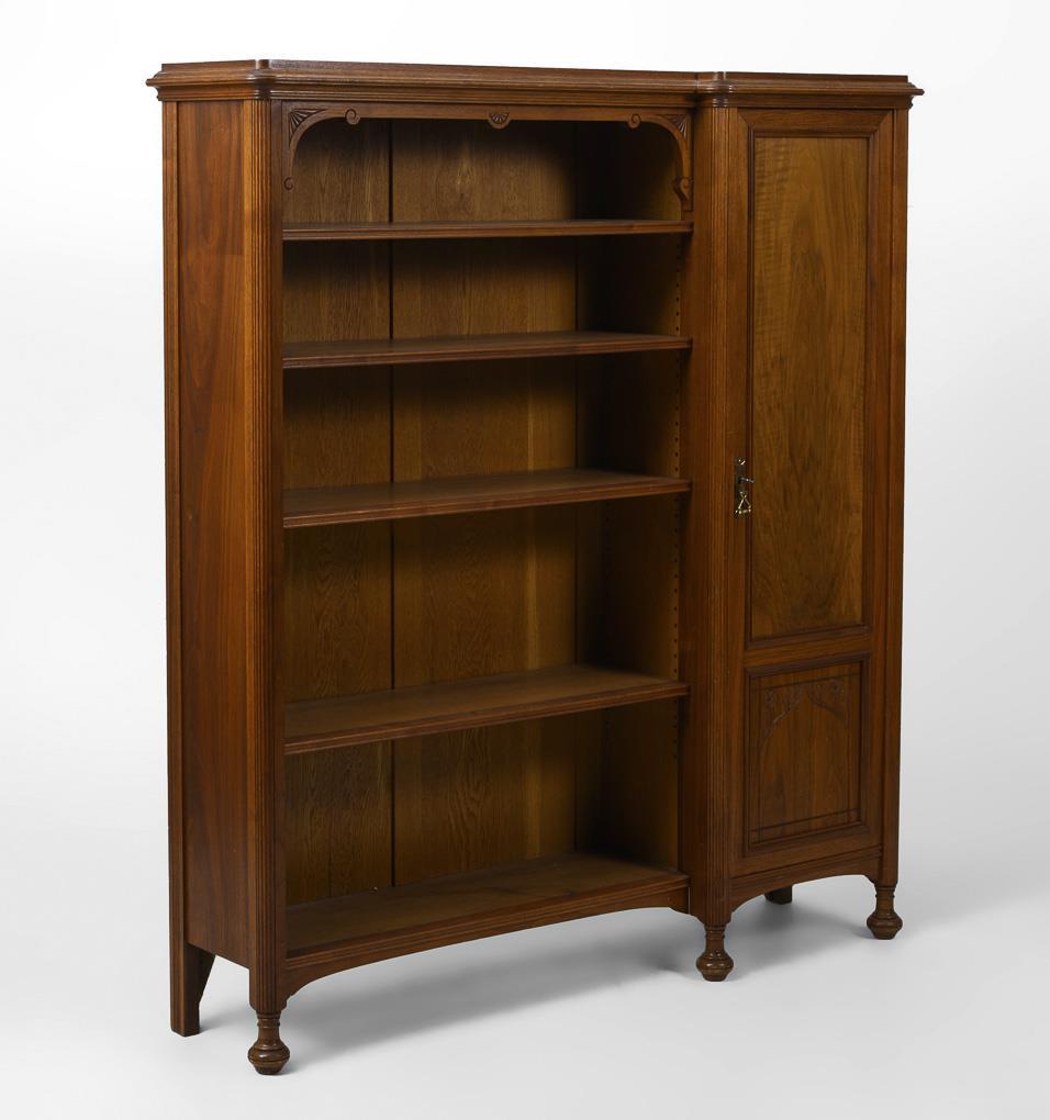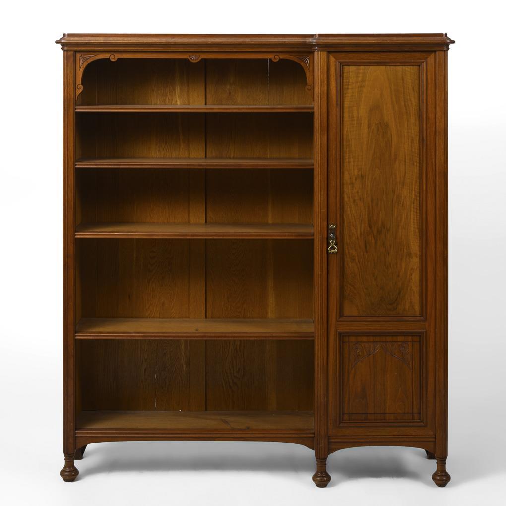 Bibliotheksschrank mit Regalwand und 1-türigem Seitenteil, Regalwand und Seitenteil jeweils mit 4 individuell höhenverstellbaren Einlegeböden; dezent dekoriert mit kannelierten Zierleisten und floralem Relief. Minimale Alters-/Gebrauchsspuren.