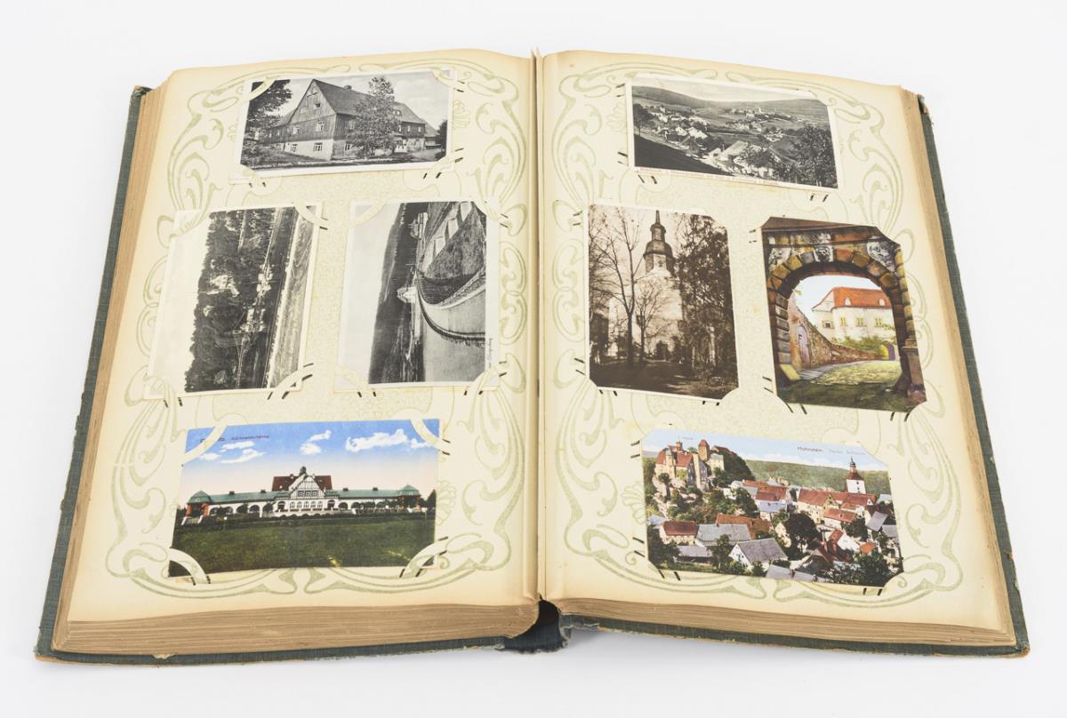 Ca. 400 Ansichtskarten nur Sachsen. Graues Album mit lila Jugendstil-Motiv.