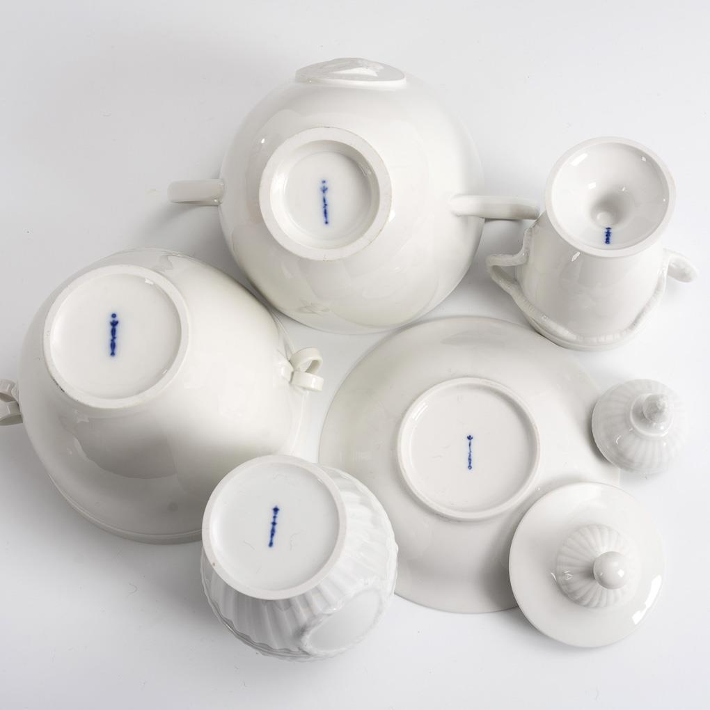 2 Cachepots mit Biskuitmedaillons: 1x mit dem Porträt von W. A. Mozart und 1x mit dem Porträt von F. Hölderlin (H 11 und 14 cm). / Deckelvase "Kurländer Muster" (H 16,5 cm). / Deckelvase mit Schlangenhenkeln (H 14 cm). / Untertasse (Ø 14,5 cm).