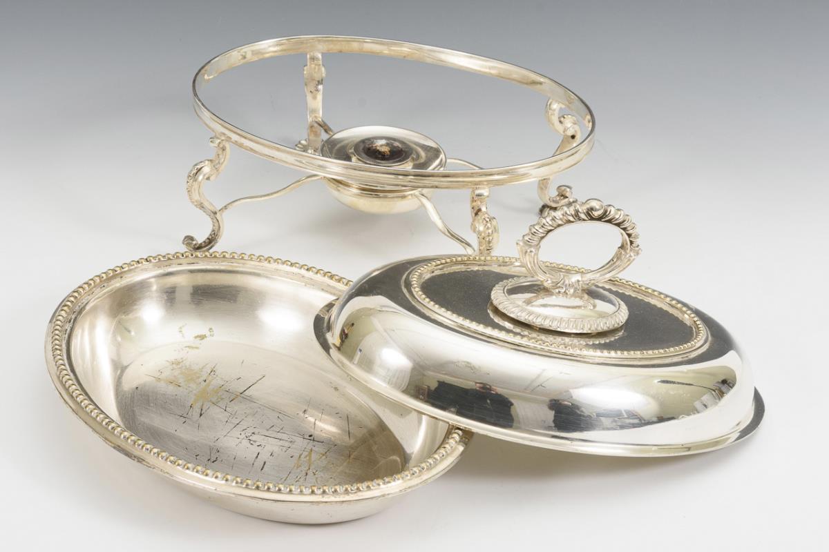 Rechaud mit Brenner und herausnehmbarer Deckelschüssel mit abnehmbarem Griff. 20,5 x 28 x 20,5 cm. / Ovale Deckelschüssel mit seitlichen Handhaben am Deckel. 6,5 x 28 x 21 cm. Gebrauchsspuren, 1 Schüssel innen mit starken Kratzern.