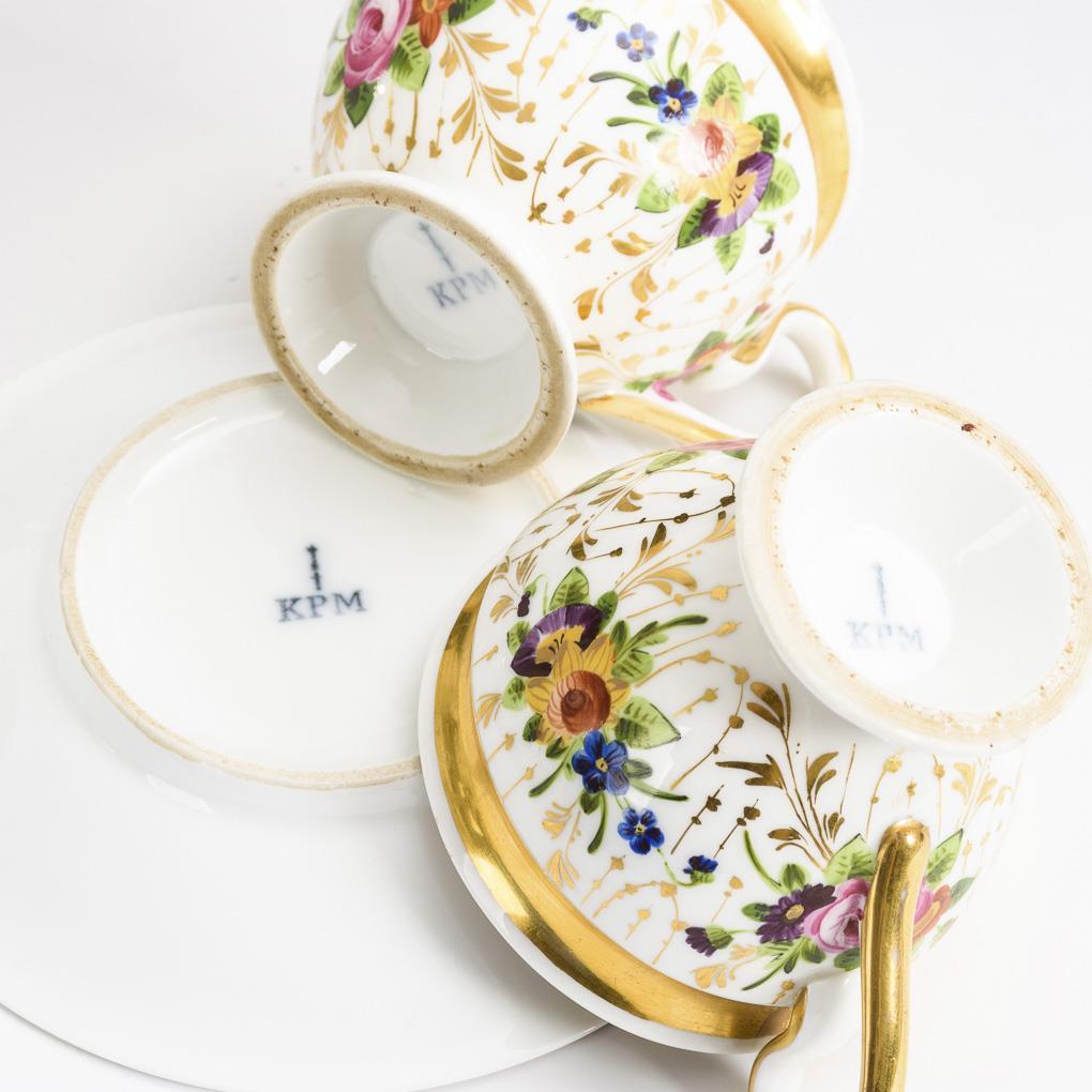 Alle goldstaffiert, 2x mit polychromer Blumenmalerei, 1x mit Umdruckmotiv. H 6 - 9,5 cm, Ø überwiegend originale Untertassen 13,5-15 cm, 2x ohne Untertasse.