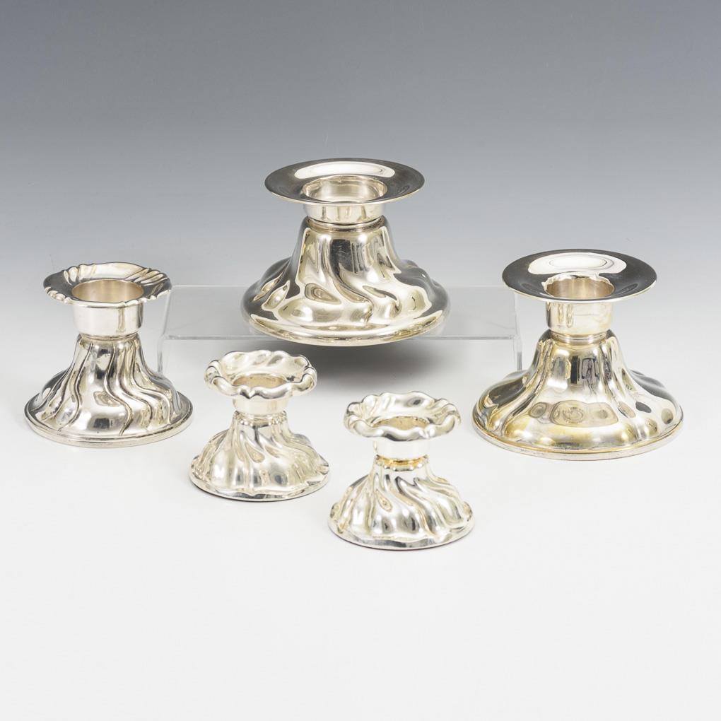 5 silberne Kerzenleuchter. Meist Schwäbisch Gmünd.
