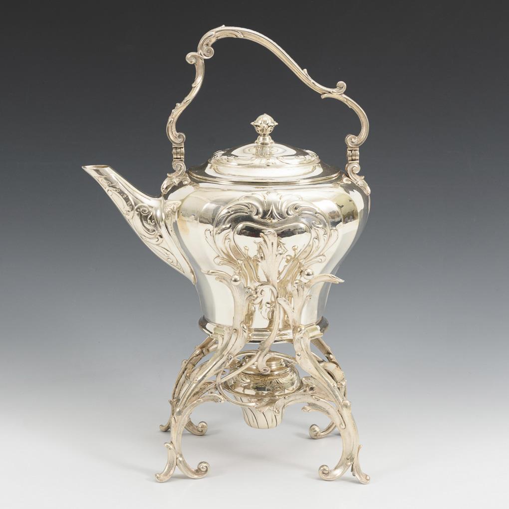 Prunkvoller Teekessel mit Rocaillen- und Rosenreliefs. Schauseitige Monogrammgravur "CD". Auf Blattranken-Rechaud mit Brenner. Rechaud eventuell ergänzt.