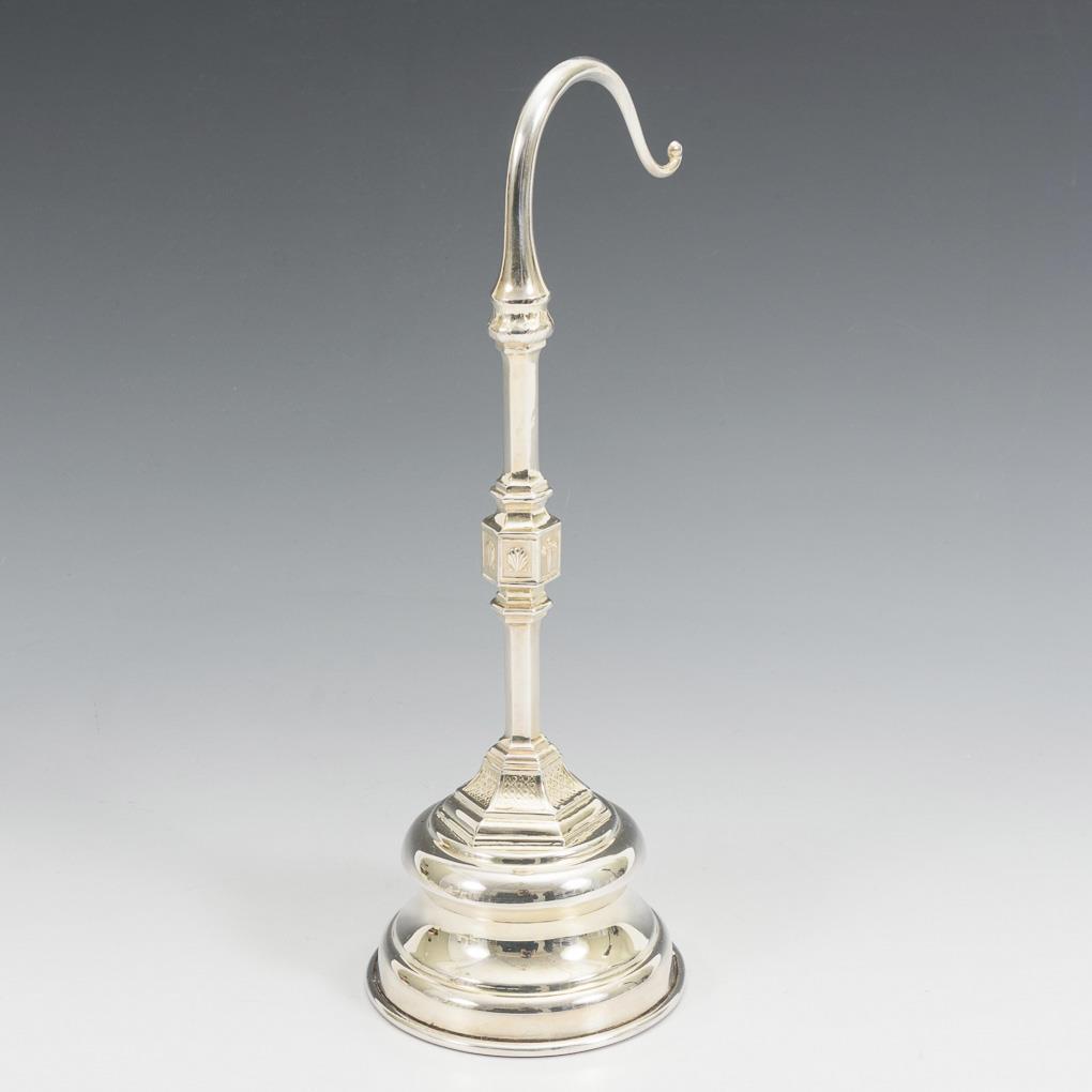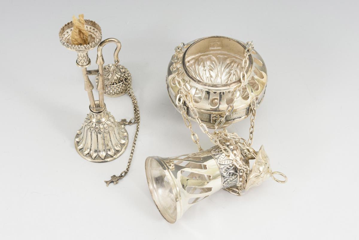 Kleine Weihrauchampel an bogenförmiger Halterung mit beschwertem Fuß. / Kleines Lämpchen mit Frucht- und Blütendekor. Kaum benutzt, im Duftlämpchen Parfümreste.