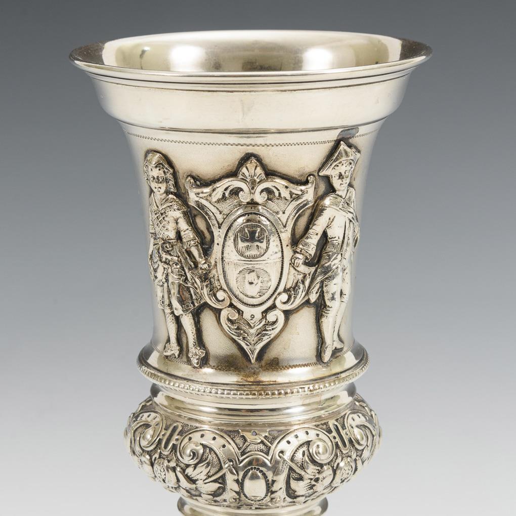 Reliefierter und gravierter Pokal "9. Würtemb. Landes=Schießen Hall 1883". Minimale Altersspuren.
