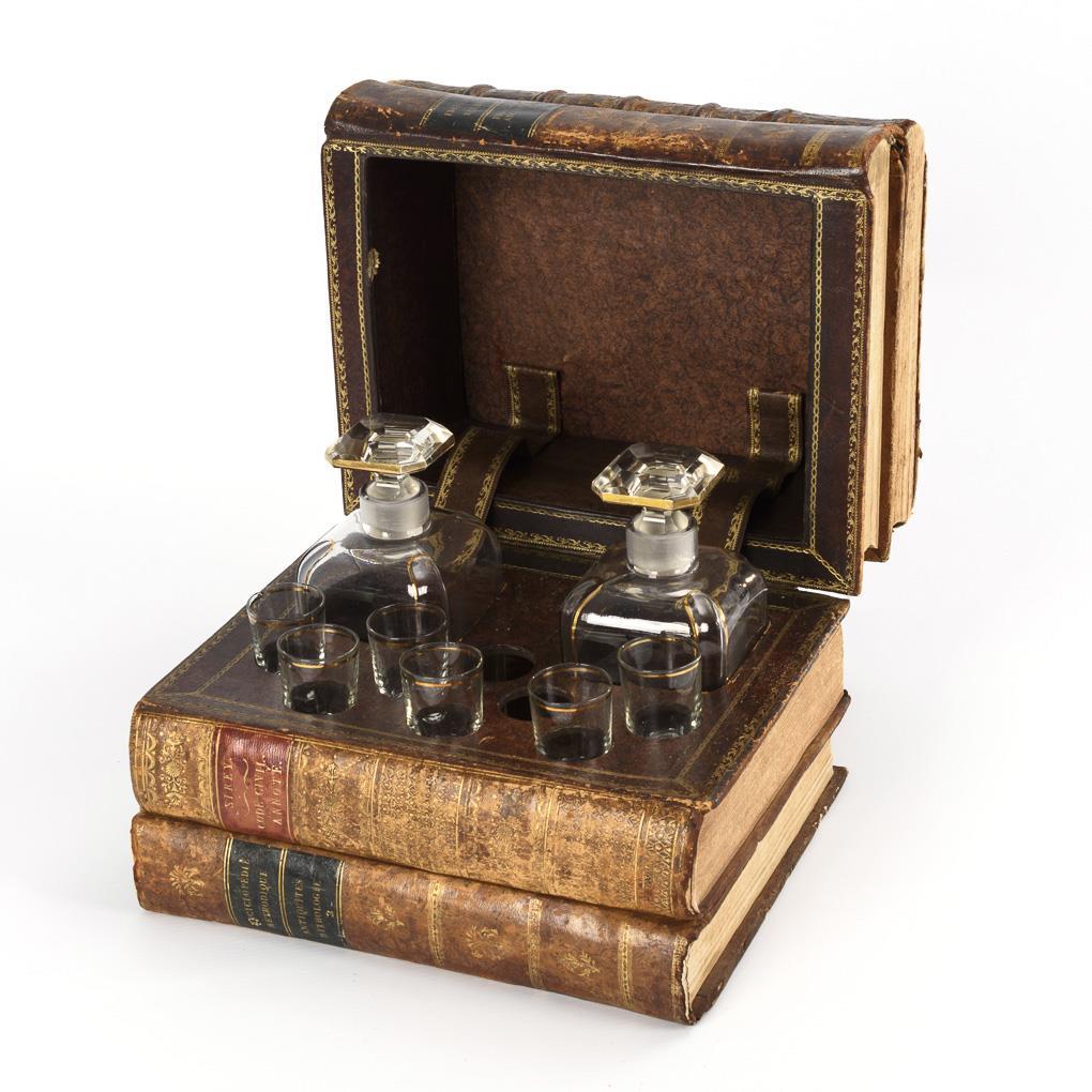 Wohl unter Verwendung alter Bücher gebaute Schatulle (z.B. "Enciclopedie Methodique"). Aufgeklappt erscheinen 2 Karaffen mit 6 Gläschen (von ursprünglich 8). Alters-/Gebrauchsspuren, Chips an einem Stopfen, 2 Gläser mit Chips, davon 1 mit kleinem Riss.